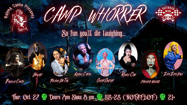 Thursday, Oct 27 @ 8 pm: Balena Canto brings you her latest tribute show to Tattooed Moms! This time we're taking a trip out to CAMP WHORROR! From already ridiculously campy classics "VelociPastor" and "Killer Klowns From Outer Space" to the truly terrifying classics like "Hereditary" and "The Shining," we guarantee that our tributes will have you DYING of laughter...In addition to performances, we'll play games where you can win Tmom's swagger and a gift card! Click the above image for info and tickets!